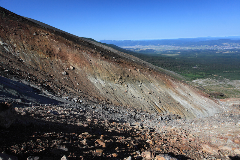 背後を振り返り、十勝岳の山腹に深く刻まれた侵食にかたずを飲んだ。写真右上の出っ張りが先ほどまで休んでいた十勝岳山頂だ。