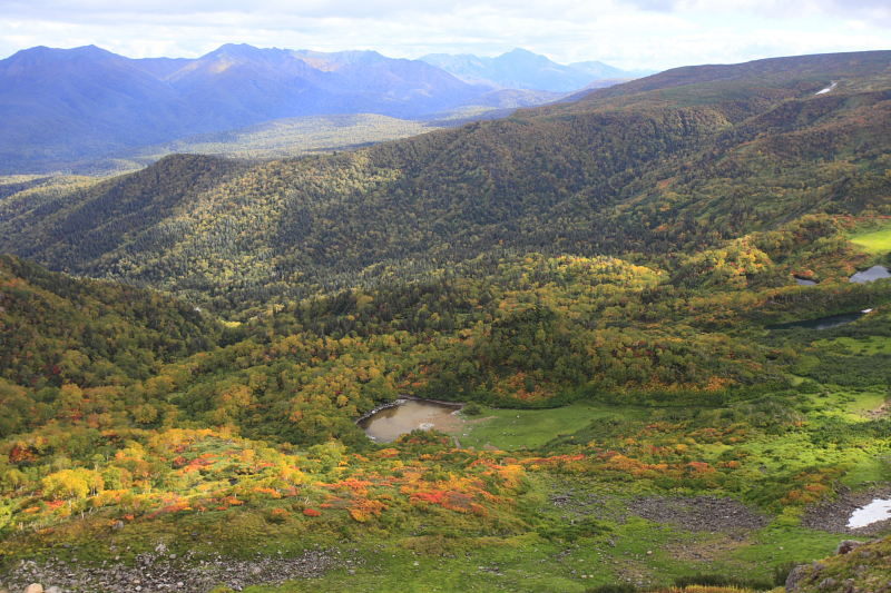 高根ヶ原から見下ろす。あいにく空には雲が出てきて光線状態は良好とは言えなかったが、眼下に見下ろす錦秋の湖沼群の美しさは圧巻であった。