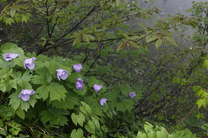 朝霧に包まれた神居尻山の山中でシラネアオイが集まって咲いていた。