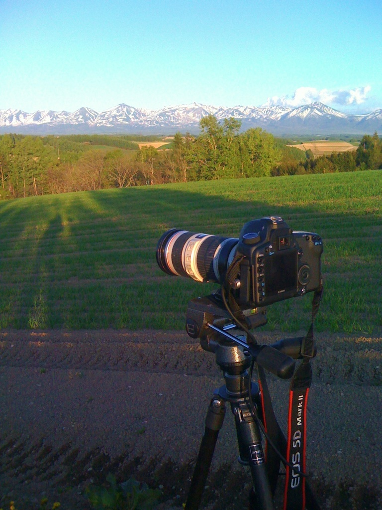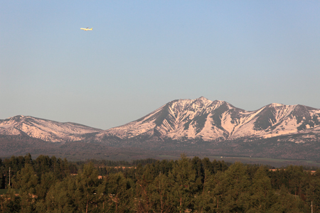 西日を受けて輝く十勝岳の上空を、飛行機がとんでった。