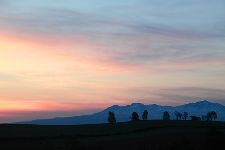 In early summer, the sun rises from the direction of Mt.Taisetsuzan in Biei.