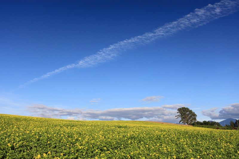 思索にふける一本の木が満開のキガラシ畑に立つ。