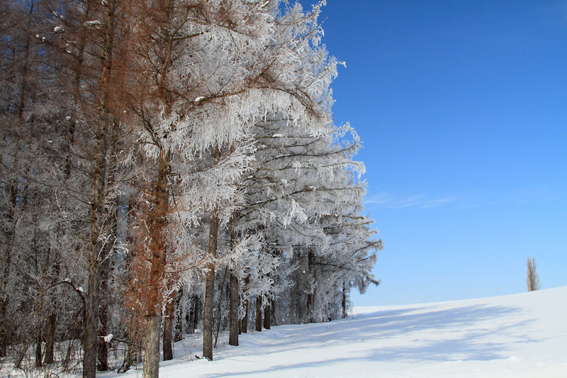 美瑛の丘を走ること1-2時間。だんだんと気温があがってきた。 丘に立つカラマツは南側から霧氷が解けて茶色の木肌が現れる。 短い宴の時間の終了だ。