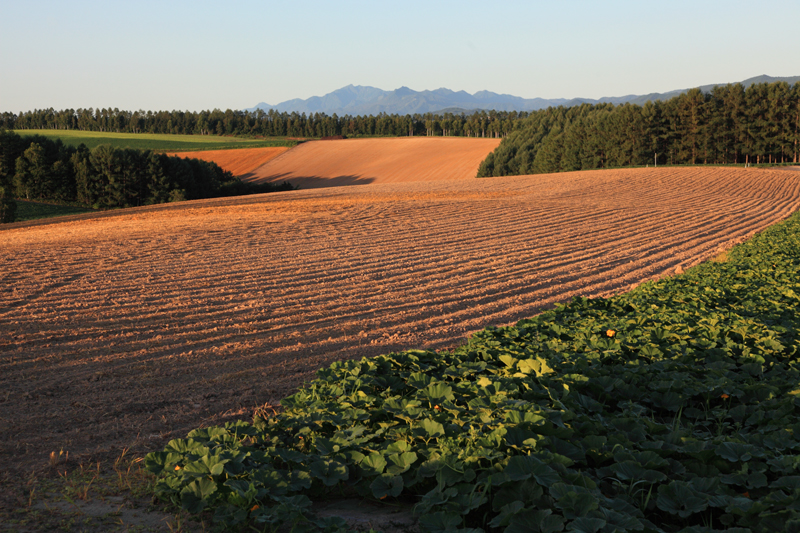 日が昇ったあと、しばらく美瑛の丘をめぐって写真を撮影した。オレンジ色の光に照らされた丘はとても美しかった。写真で奥に見える山は秀峰芦別岳だ。