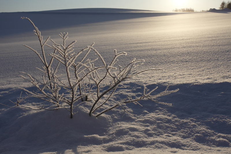 モノクロームの氷の世界が、日の出とともにオレンジ色に染まり、霧氷をまとった木の枝が柔らかな朝の光に包まれていた。
