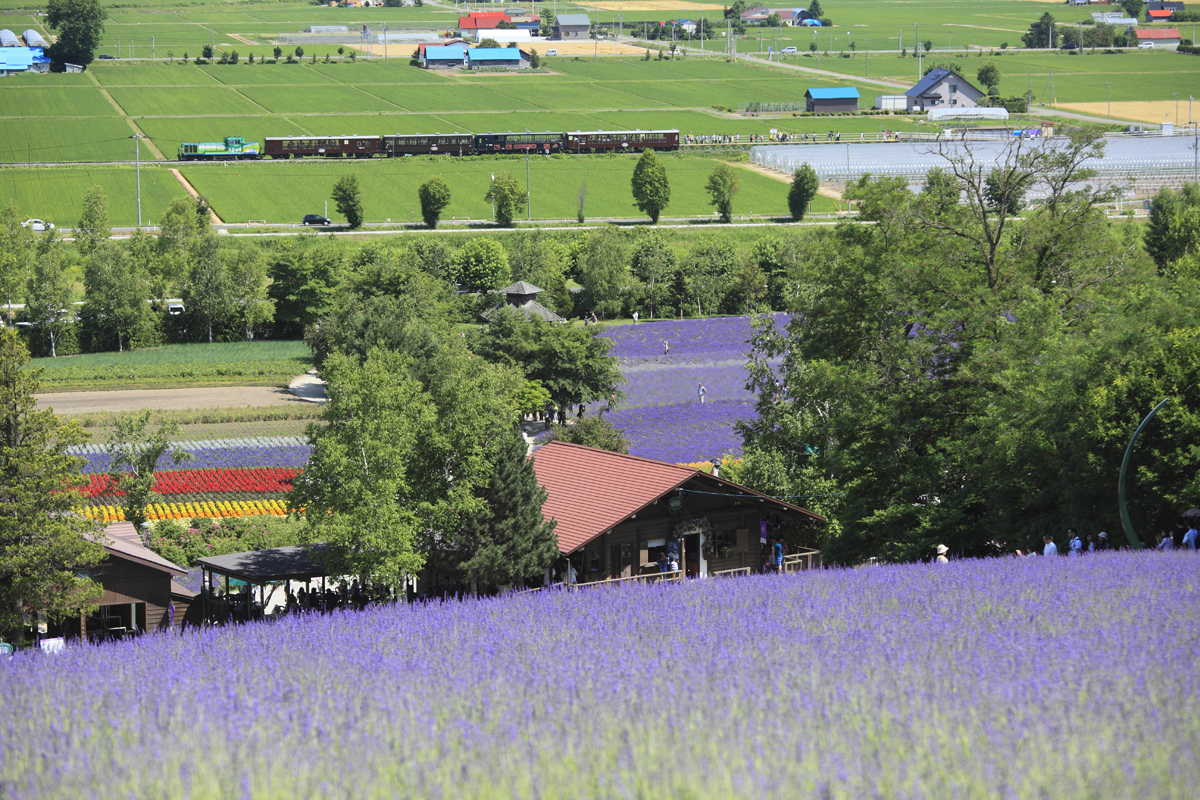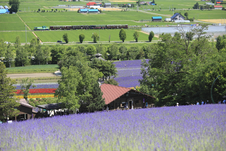 ラベンダー畑の向こうに、富良野美瑛ノロッコ号が到着。