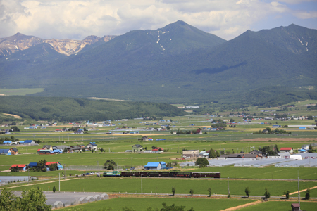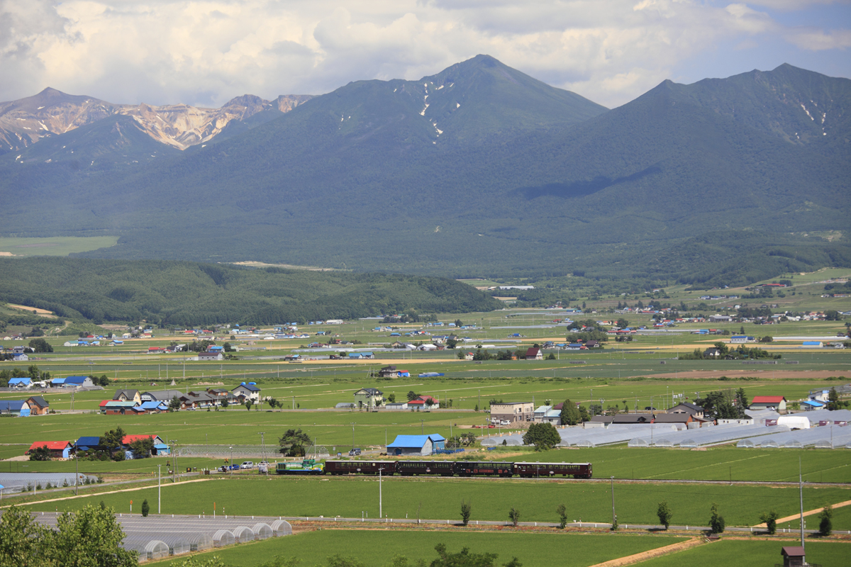 十勝岳をバックに、富良野美瑛ノロッコ号が走り抜けてゆく。