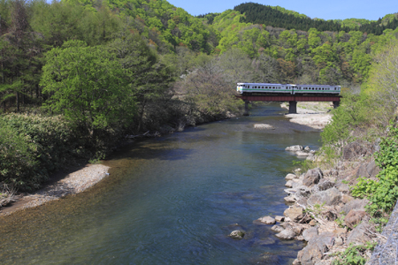 新緑に覆われた鉄橋を渡って江差方面へと向かう。