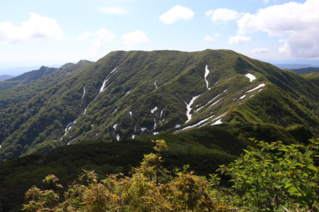 遊楽部岳への長い登り。8合目にあたる臼別頭に立つとようやく遊楽部岳の姿が見えた。その山容はまさにたおやかなる道南の楽園。