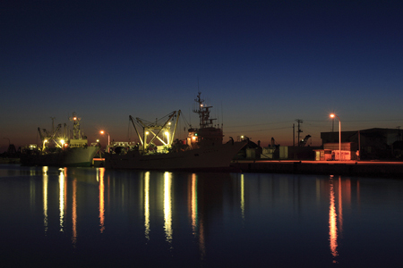 日もすっかりと暮れた時刻、残照の漁港で灯りをともす数隻の漁船が見えた。