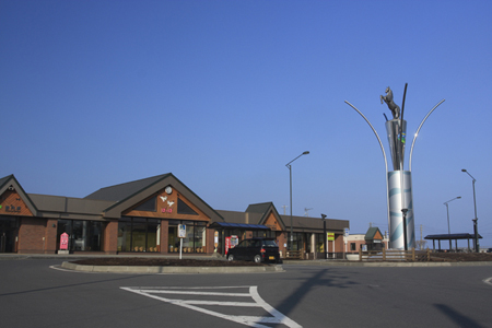 夜にはライトアップされるサラブレッドのモニュメントが美しい。