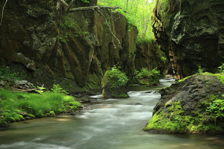 両側の絶壁には数百種類もの苔が生えており、美しいモスグリーンの色調を帯びていた。ひんやりとした空気の中、マイナスイオン溢れる何とも神秘的な場所であった。