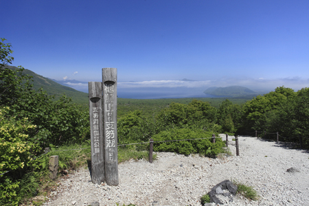 樽前山に登り始めるとすぐ背後に支笏湖の展望が広がる。おそらくこの写真は樽前山を登る多くの人が撮った写真でしょうね。