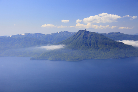 恵庭岳をアップで撮ってみた。支笏湖のブルーが空の青と溶け合って、まるで恵庭岳が空に浮かぶ天空の城のように見えた。山頂では僕のほかにもう一人登山者が休んでいたがその男性はまもなく荷物をまとめて下山していったので、僕は十分にこの眺めを独り占めすることができた。