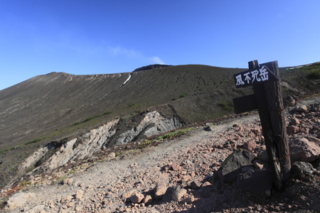 分岐から樽前山を見上げる。 ここから樽前山を見るのは初めてだった。荒々しく浸食された斜面と残雪のコントラストが美しかった。
