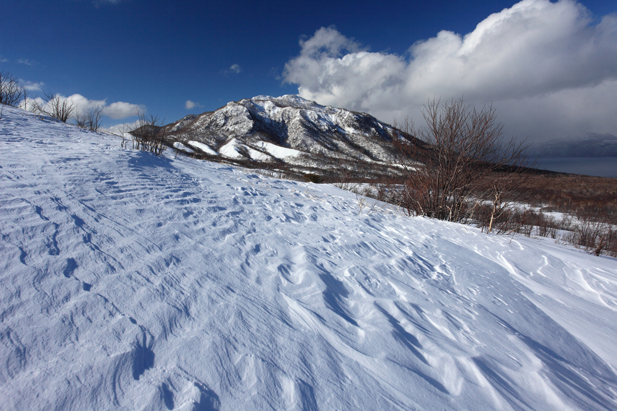 スノーシューを履いて一時間半あまりの登り。稜線に出たときシュカブラの向こうに風不死岳の全容が眼前に現れた。