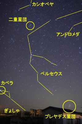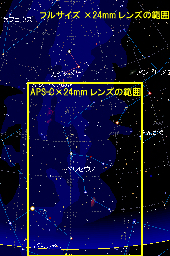 カメラを縦に構えると、天空70度近くまでのケフェウス座まで入ってしまい横方向にはアンドロメダもすっぽりおさまってしまう。APS-CのKissX2ではカシオペヤの一部とアンドロメダの足しか写っていなかった。フルサイズで南の方角を見て撮影したら夏の大三角まで入ってしまうことになる。