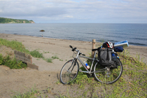 やむなく4kmほど引き返し、海岸沿いの野塚野営場にテントを張ることにした。前情報では砂浜のキャンプ場なので自転車の乗り入れは難しいと言われていたが、実際には駐車場近くに自転車を止めてすぐそばにテントを張ることができるし、近くに温泉や商店もあったので結果的にここにしてよかったと思った。天気も悪くてキャンプ客があまり多くなかったのも幸いしたのかもしれない。