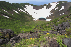山頂付近より父釜爆裂火口とミヤマキンバイ。この時期にしか見られぬエメラルドグリーンの池も見られた。これが羊蹄の湧水となるのだ。