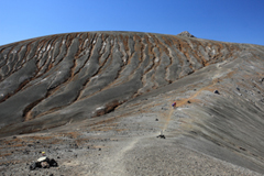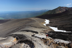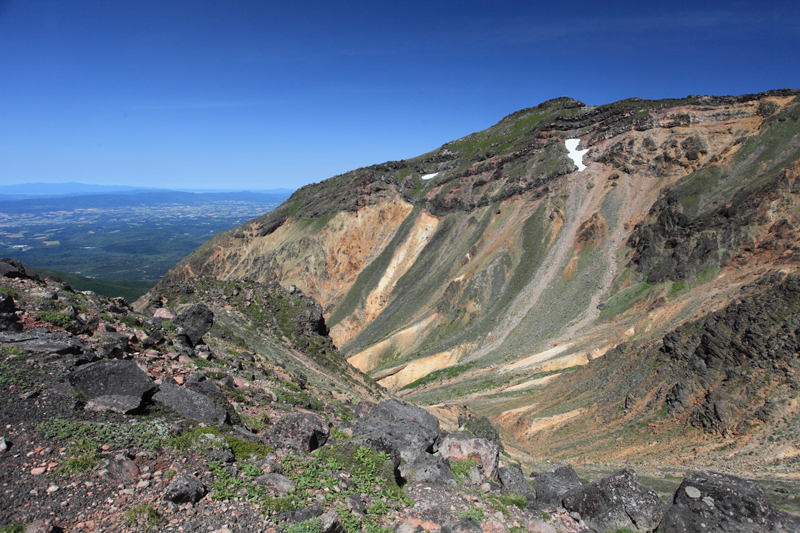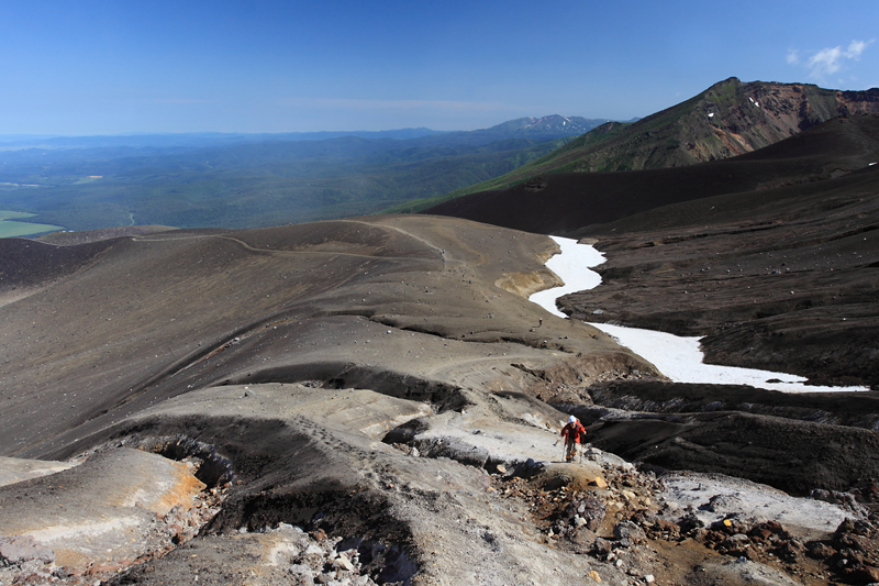 背後を振り返り、十勝岳の山腹に深く刻まれた侵食にかたずを飲んだ。写真右上の出っ張りが先ほどまで休んでいた十勝岳山頂だ。