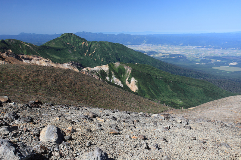 十勝岳から美瑛岳に向かうコルにて。すごいスケールの山容が広がっていた。はるかかなたに美瑛岳の山頂が確認できた。そして眼下には美瑛の町並みが・・・。