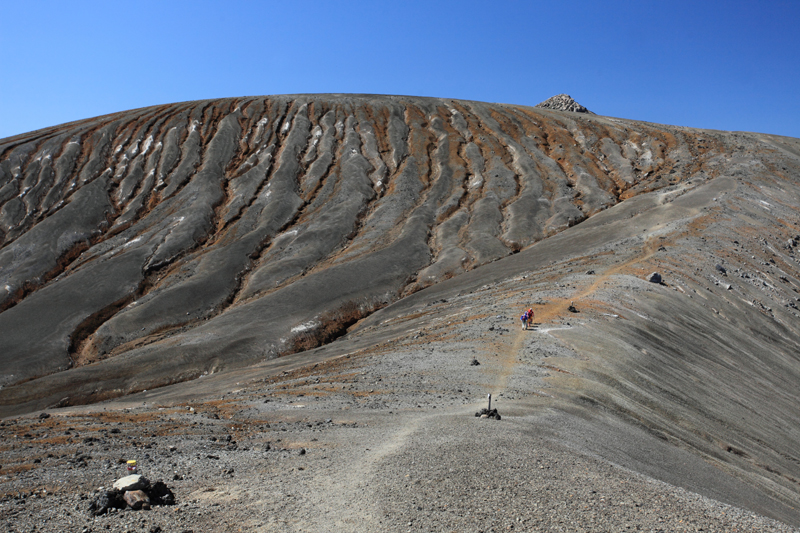 最後の登り坂から背後を見ると、荒々しい地形の向こうに美瑛岳の雄姿が。後方を登る登山者の姿がちっぽけに見える。水、食糧、時間、体力、どれも十分に残っていたし、経路はあらかじめGPSと地図で確認してある。この絶景が最終的に美瑛岳への縦走を決断させることになった。