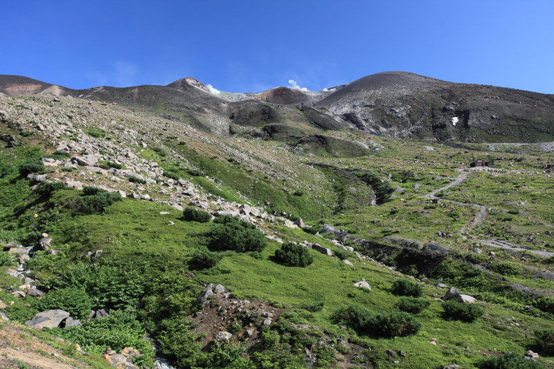 ここで十勝岳の山頂をくっきりと見ることができた。なんだかまだまだ遠い先に思えてしまう。ここからはキツい登り坂となる。