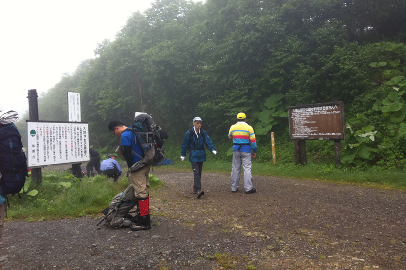 ここまで来るともう僕のsoftbankのiPhoneは圏外になってしまった。層雲峡で天気予報をチェックしたら晴れの予報となっていたはずだが、写真の通り登山口では濃い霧がかかっていた。
