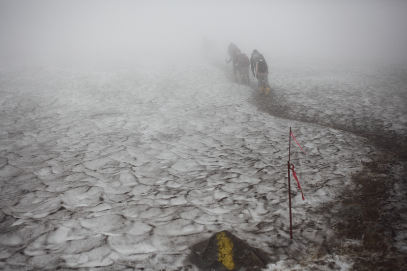 緑岳に向かってコルに下っていくと、辺りは急に風が強くなり、雨交じりの濃霧に覆われた。GPSを確認しながらテント場への分岐を探したが、10分もしないうちに数メートル先も見えないホワイトアウトになってしまった。それからさらに10分ほど歩いたのち僕はついにへなへなと座り込んでしまった。辺りには誰もいない。このときの恐怖感は並大抵のものではなかった。そしてちょうど3年前のトムラウシでの遭難事故を想像した。もし体力の落ちている状況下の山奥深くでこのような天候の変化に出くわしたら、まず生きては帰れないだろう。僕はザックをおろすとレインカバーを取り出してザックにかぶせ雨具を着込み、もと来た道を引き返すことにしたのだ。
