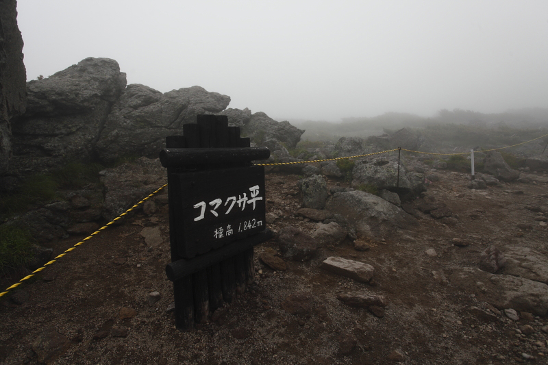 奥の平を過ぎてさらに登ってゆくと、コマクサ平という場所に出る。未だに天気はガスがかかった状態が続いていた。看板を見ると標高1,842メートルと書いてある。GPSを見ると標高は1,837メートルをさしていたから誤差は5メートル。ここでGPSの高度をキャリブレーションしようと思ったがやめておいた。というか、キャリブレーションのやり方を忘れていたに過ぎない(笑)。
