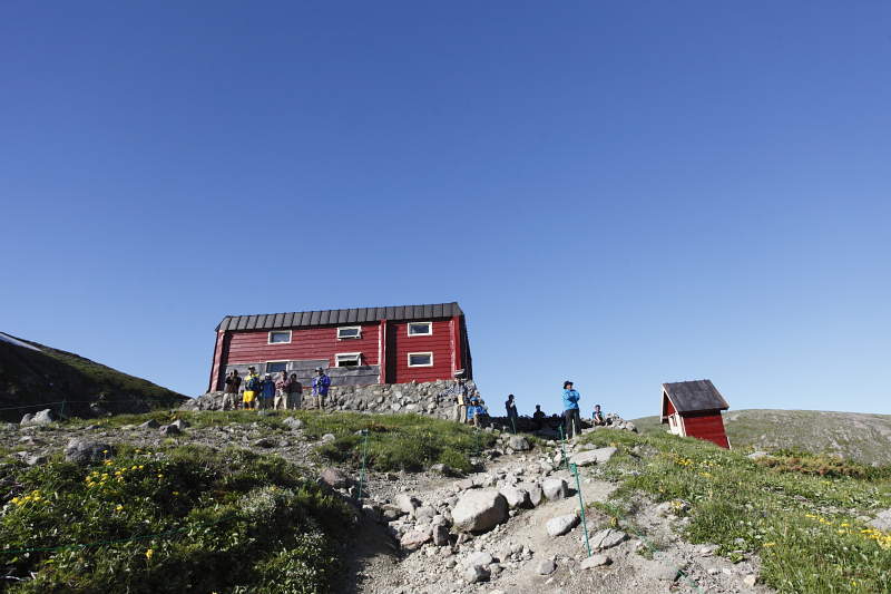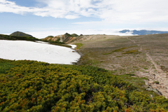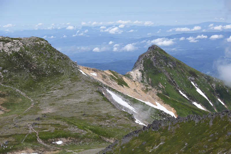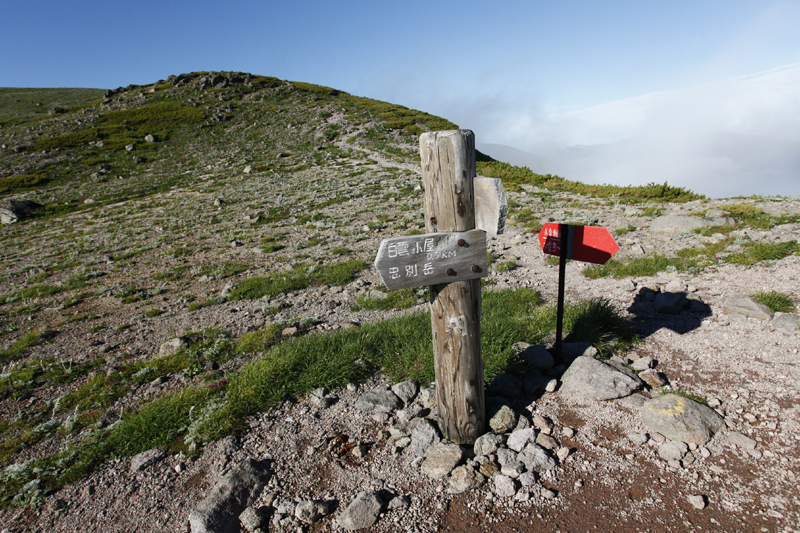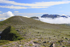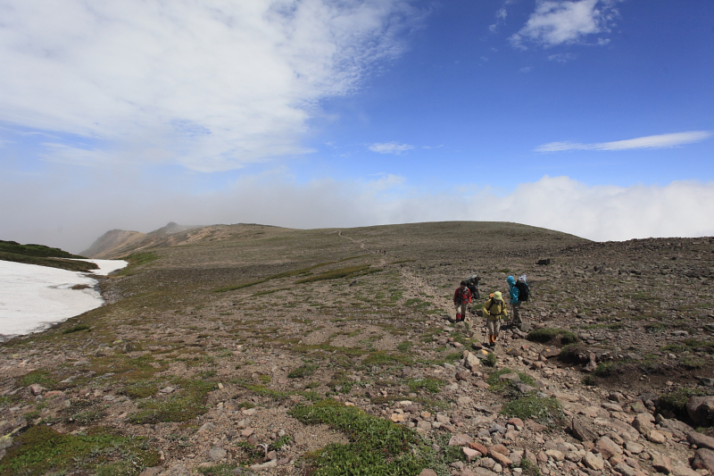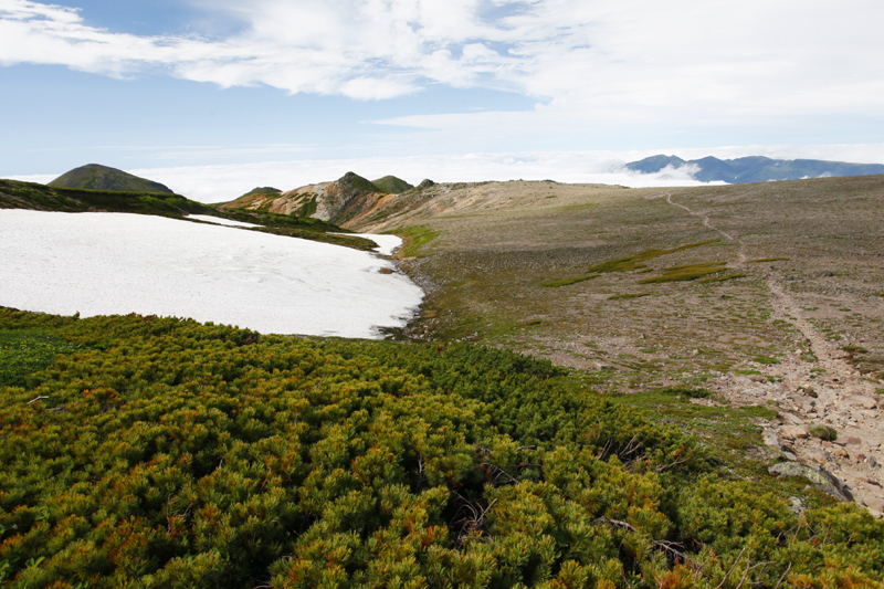 しばらく休憩をとった後、白雲岳テント場に向けて歩を進めた。ここからテント場への登山道は2つある。ひとつは白雲分岐から下る道、もう一つは小泉岳経由で緑岳方面に下る行程だ。登山者の多くは前者を利用することが多いと思われる。白雲分岐にザックをデポして白雲岳を往復してから避難小屋に下る人が多いためだろう。