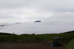 山頂に向けて登りを続けていると、頭上の雲がうっすらと消えて青空が見えかけているのがわかった。天候の回復なのか、それとも自分が雲の上に出ただけなのか。登ってきた方角はまだガスで覆われていた。