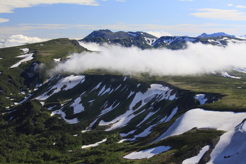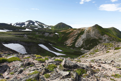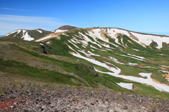 なだらかに見える緑岳の東側は急峻な絶壁となっていた。大きく残った雪渓がそのスケールを物語る。