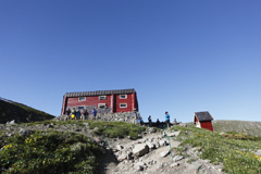 避難小屋に戻ると多くの人が小屋の前に立っていてトムラウシから高根ヶ原の風景を見渡していた。