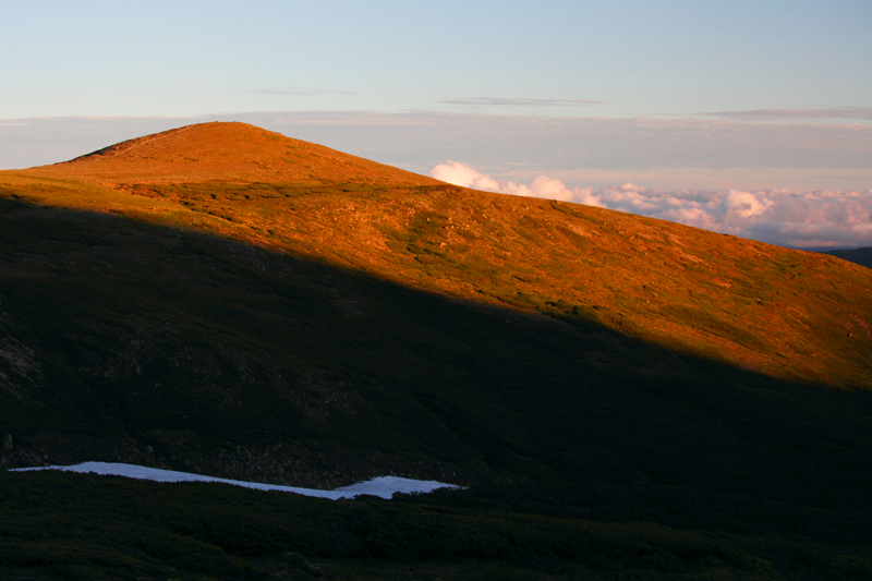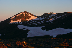 大分日が西に傾いてくると、テント場からは、白雲岳の影を映すオレンジ色の緑岳が見えた。