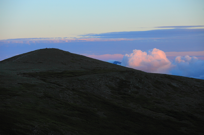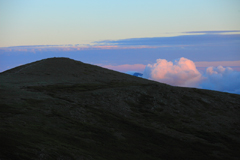 日が暮れたあとの緑岳にはポッカリとピンク色の夕雲が浮かんでいた。