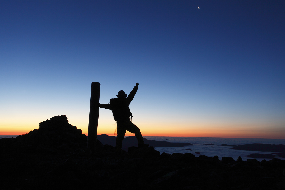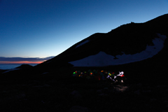 前方を見ると、東の方は少しずつ明るくなってきている。稜線に出れば地平線が見えるはずだ。果たしてそこに待っているのは、山々のシルエットか、それとも…。