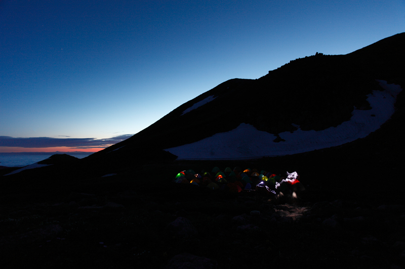 日が沈んだあとで、避難小屋からテント場を見ると、残照の空の下で光が灯った色とりどりのテントが美しかった。ライトを片手にあるく人の光がまるでお化け屋敷のヒトダマみたいだ。