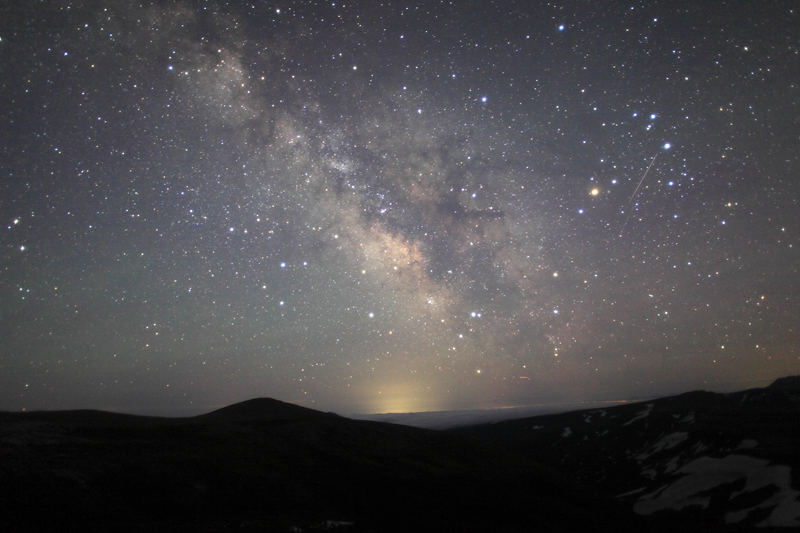 テントの中を整理し終えると、僕はまた外に出た。周りはすっかり暗くなっていて、他人のイビキも聞こえていた。そして空は…満天の星だった。南の方角には射手座に端を発する天の川が立ち上っていた。三脚の脚が一本ないのが悔やまれたが、短くなった脚に軍手をはめて、岩場に固定すれば充分使える。構図を決めてシャッターを切った時、さそり座のアンタレスの横を流れ星が落ちて行った。