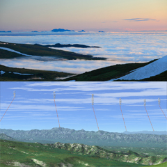 後日、カシミール3Dというソフトを用いて、白雲岳避難小屋から見える山々をCG構成してみた。当初半径100kmの範囲でレンダリングしてみたがうまくいかなかった。もしやと思い、半径を200kmにあげて描画してみたら、やっと山を確認することが出来た。その結果、クジラの頭は芦別岳であった。そしてさらにこの日、大雪山からは遠く恵庭岳まで見えていたことがわかった。この事実にはさすがに度肝を抜かれた。と同時に、カシミール3Dのすごさを再確認した。