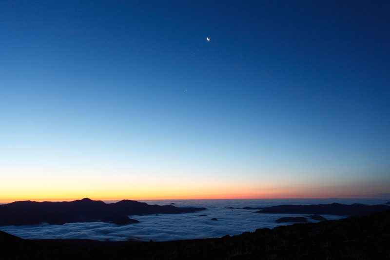 翌朝の日の出時刻は午前4時。僕は2時半すぎにテントをでた。もちろんご来光を見るためだ。今回は緑岳に決めていた。白雲岳は昨年9月にご来光を見た事があったのと、今回は朝日に輝く旭岳と白雲岳を見たいと思ったからだ。あたりはまだ真っ暗だったが、尾根の向こう側の東の空はうっすら明るくなっていた。そして、日齢25の残月と木星、明けの明星が煌々と輝いていた。