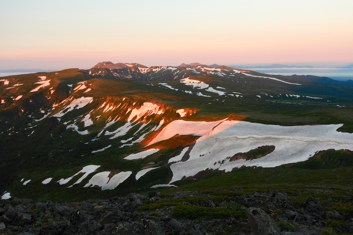 南の方角には、高根ヶ原から続く雪の残った大きな斜面、そして朝日に染まったモルゲンローテのトムラウシが威風堂々と姿を見せていた。これだ。まさに僕が夢に描いた景色が目の前にあった。