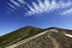 間宮岳分岐を過ぎて中岳方面に進んでいくと、背後には熊ヶ岳にかかる筋雲とゼブラ模様の残雪が対比をなしているように見えた。