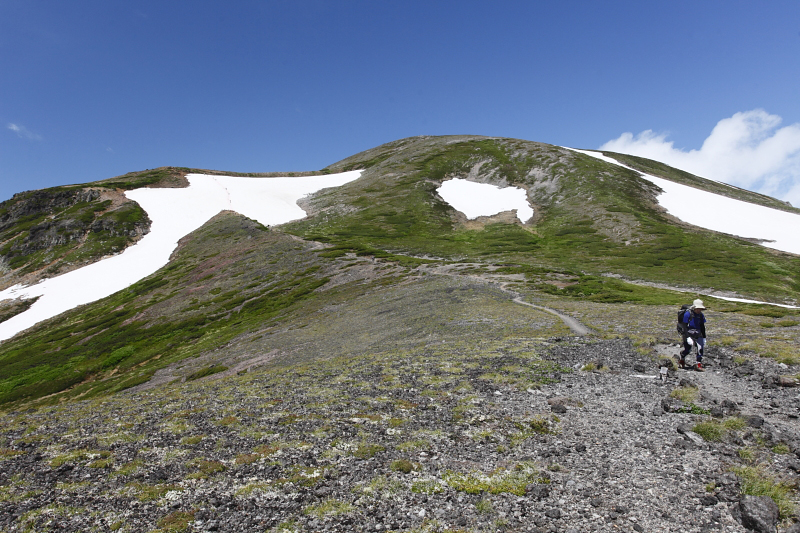 北鎮分岐に戻ってザックを背負うと、その重さがなお一層重く感じられた。分岐から東側にはかなり急な大きな雪渓が残っており、地面の赤土のために登山者による赤い道が形成されていた。この雪渓のことは事前の情報で知っていたため僕は軽アイゼンを持参していた。しかしそれほど大変な道ではなかったし何よりも軽アイゼンをザックから取り出す作業が面倒だった。結果的にせっかく持ってきた軽アイゼンは使うことがなかった。