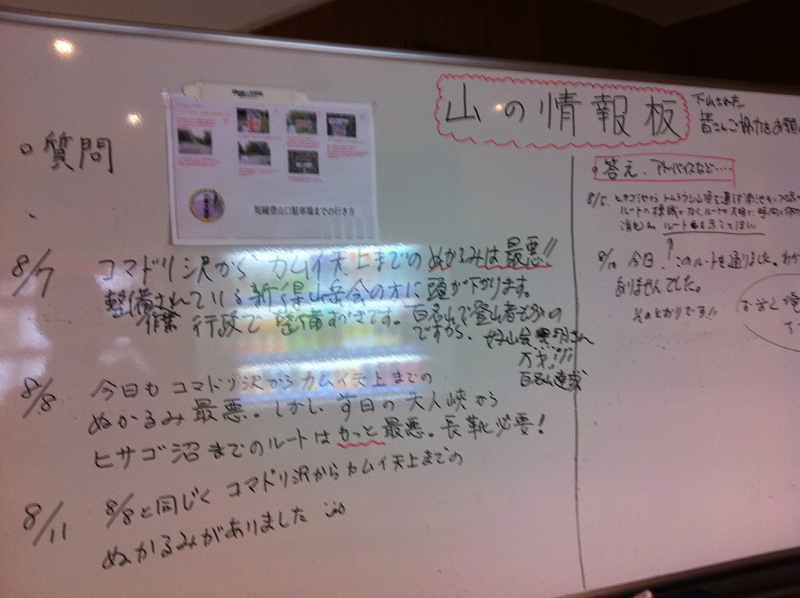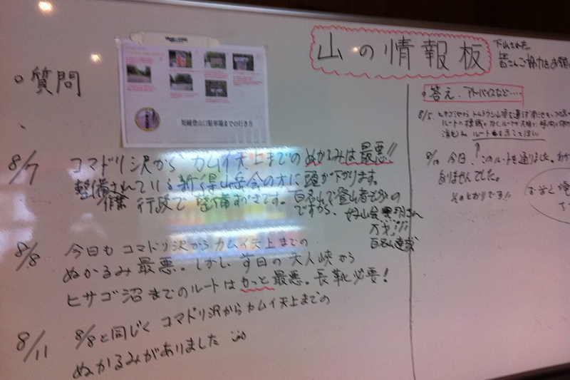 旅館の客室から大浴場に向かう廊下に、「山の情報板」というホワイトボードがあった。それをみると、カムイ天上からコマドリ沢までの道がぬかるみでひどいのだという。数日前でさえそうなのだから、今豪雨が降っているこの状況下では明日晴れたとしても相当の覚悟が必要だろう・・・と思いつつ、車の中で眠りについた。