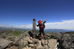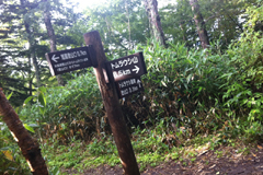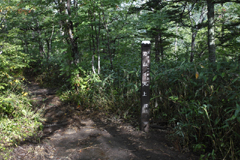 短縮口から登ってしばらくして温泉からの登山道と合流する。短縮口からの行程は温泉から登るよりも1時間以上の時間短縮が可能とのことで現在はここから登る人が圧倒的に多いという。