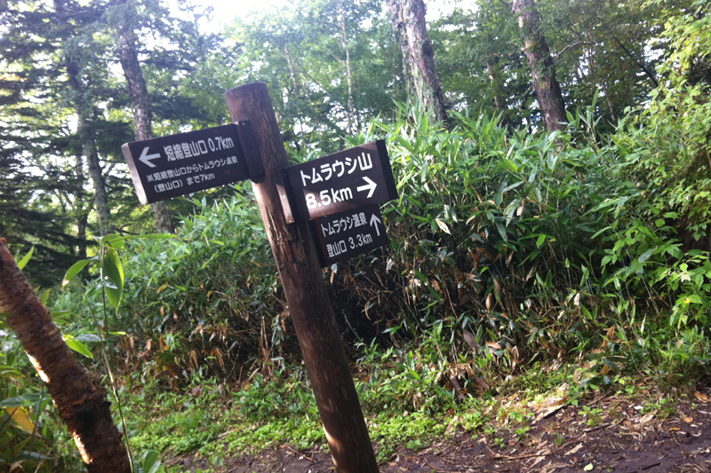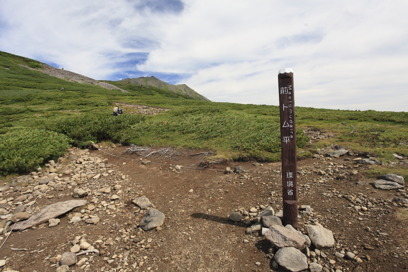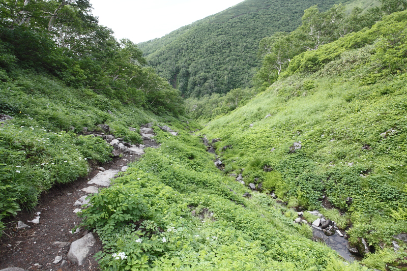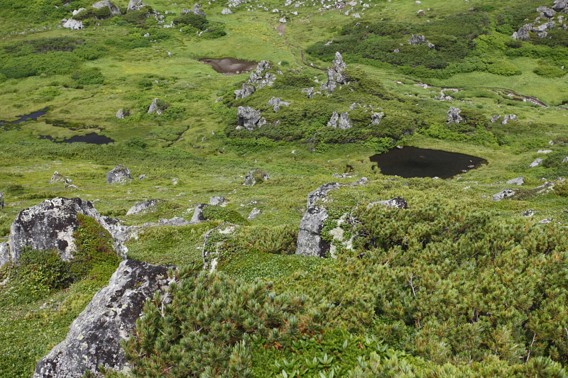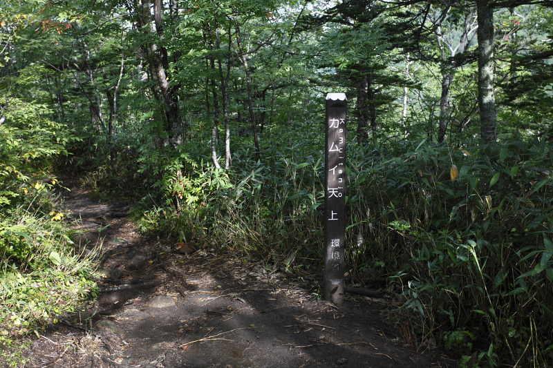 1時間ほど快適な山道を歩いたがここまで誰とも出会うことがなかった。前方や後方を歩く人の熊鈴の音も聞こえない。ましてや鳥の鳴き声も聞こえない。僕はヒグマに遭遇しないか少し恐怖感を覚えながら登っていた。実は前々日、東大雪荘の入り口で小熊の目撃情報があったのである。これはまさに親熊が近くにいるという事実を示しているに他ならない。熊鈴を威勢よく鳴らしながら1時間ほど登るとカムイ天上にでた。