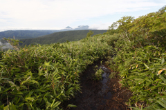 そこからコマドリ沢までの山道は延々と続くぬかるみであった。まさに昨日、東大雪荘での掲示板の通りである。しかも今朝までの豪雨によって状況はますますひどくなっていたと思われる。泥んこ道を重いザックを背負って歩いていると前方の笹薮の向こうに十勝岳連峰が見渡せた。一番左の三角形の山は下ホロカメットク山だ。