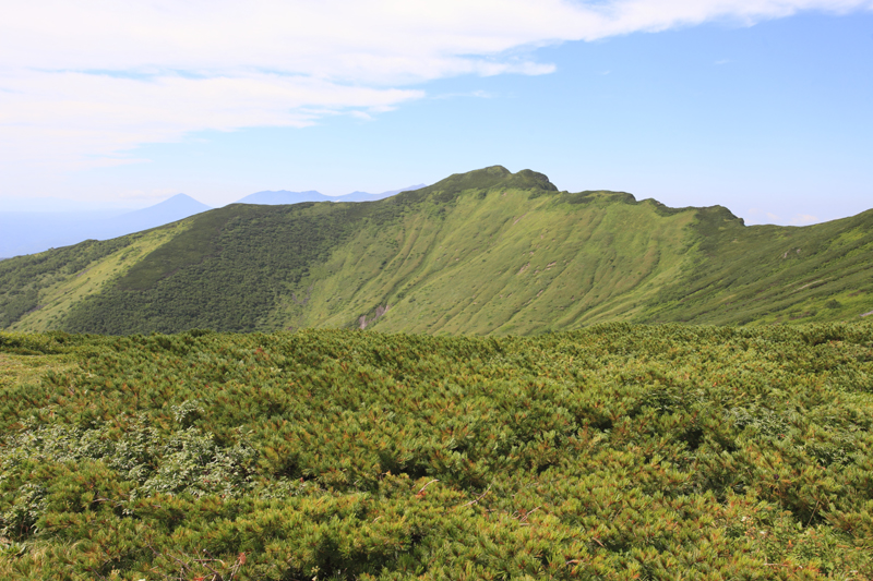 そして後ろを振り返ると、ツリガネ山から続く稜線の彼方に十勝岳連峰の姿が見え始めていた。