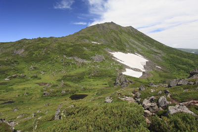 双耳峰の斜面の向こうに表大雪の山々を望むことができた。本当はここからヒサゴ沼まで下って一泊予定であったが、今回は思うところあってそのまま下山することに決めた。